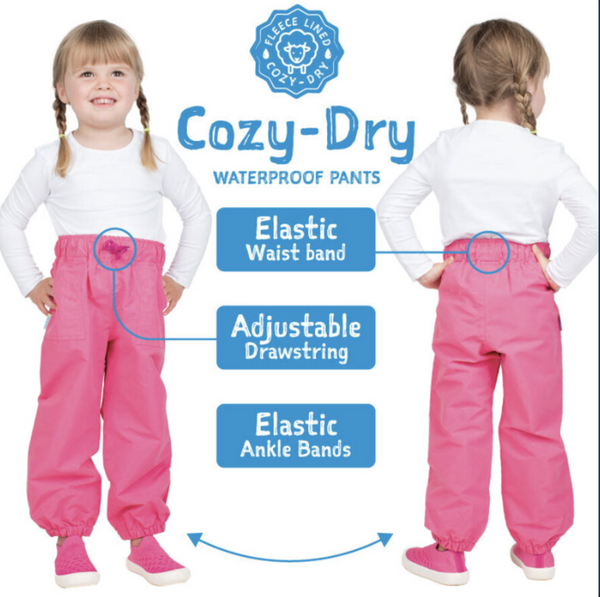 Waterproof: with Bionic-Finish® technology from Germany, PVC & fluorine free Fleece-Lined: with warm & soft fleece, fully lined, even inside the pockets Soil Repellent: great for active play Adjustable Waistband: comfortable elastic waistband that can be further adjusted with a drawstring Elastic Ankle Bands: to keep out the rain or snow and to fit better for different leg lengths Windproof & Breathable: keeps warmth inside yet allows moisture out