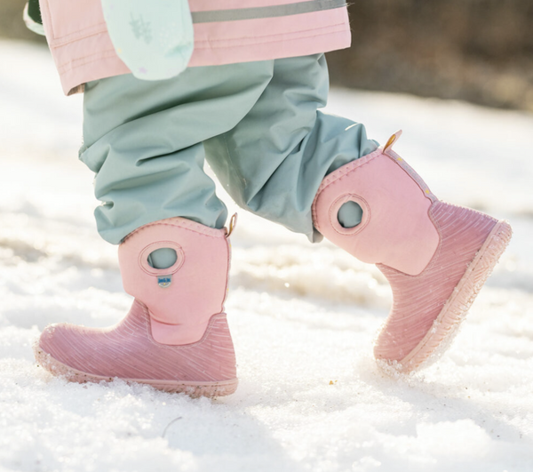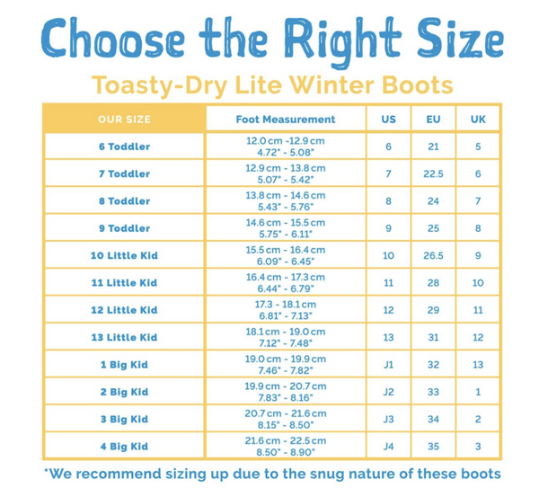 Due to the layer of fleece lining inside these winter boots, we recommend going up one size from your child’s current shoe size. WATERPROOF: Conquers rain, snow, slush & puddles! Made with DWR coated neoprene over durable rubber. Fully waterproof, works as a great pair of cozy rain boots for your toddler. LIGHTWEIGHT: Not clunky like your typical winter boot WARM: Lined with Sherpa fleece for a snug and comfortable fit. Extra insulation layer helps keep feet warm in snow & slush. Rated -10 Degrees C/ 14F with socks on. EASY-ON: Simple finger holes & back pull tab helps toddlers put on these boots all by themselves MACHINE WASHABLE: Machine washable on gentle cycle cold to lukewarm.