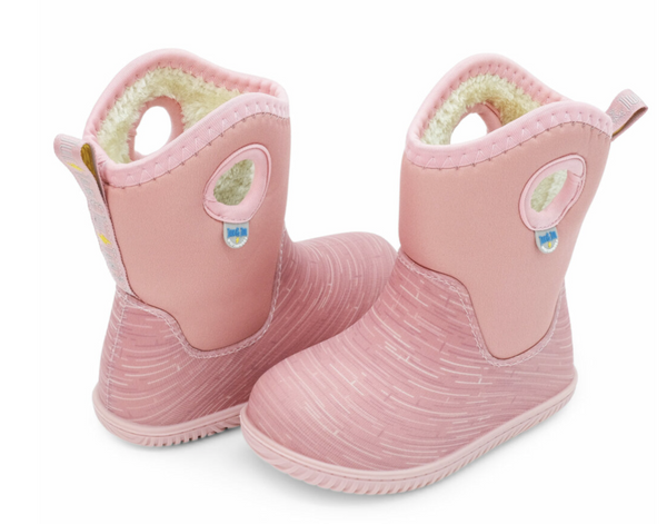 Due to the layer of fleece lining inside these winter boots, we recommend going up one size from your child’s current shoe size. WATERPROOF: Conquers rain, snow, slush & puddles! Made with DWR coated neoprene over durable rubber. Fully waterproof, works as a great pair of cozy rain boots for your toddler. LIGHTWEIGHT: Not clunky like your typical winter boot WARM: Lined with Sherpa fleece for a snug and comfortable fit. Extra insulation layer helps keep feet warm in snow & slush. Rated -10 Degrees C/ 14F with socks on. EASY-ON: Simple finger holes & back pull tab helps toddlers put on these boots all by themselves MACHINE WASHABLE: Machine washable on gentle cycle cold to lukewarm.