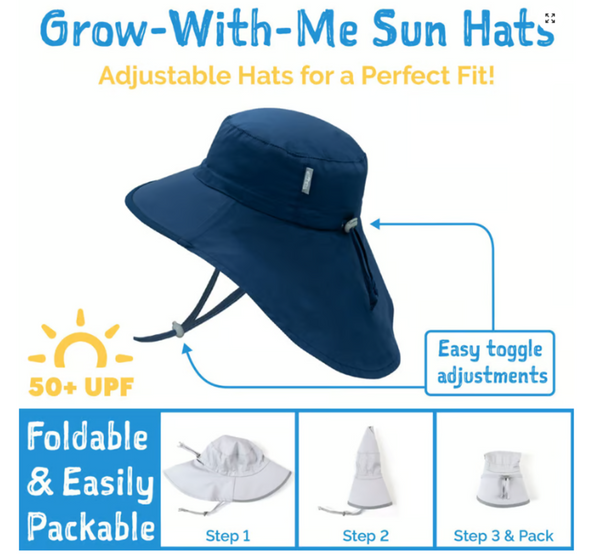 Features: 100% cotton. 50+ UPF rated fabric & wide brim for sun protection. Perfect fit with adjustable head strap & toggles. Break-away clip to minimize safety hazards. Fold-able & pack-able for easy storage and travel.