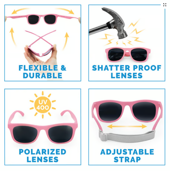 Flexible, un-break-able, stays-on! Polarized, shatter-resistant mirrored lenses. 100% UVA & UVB sun protection.