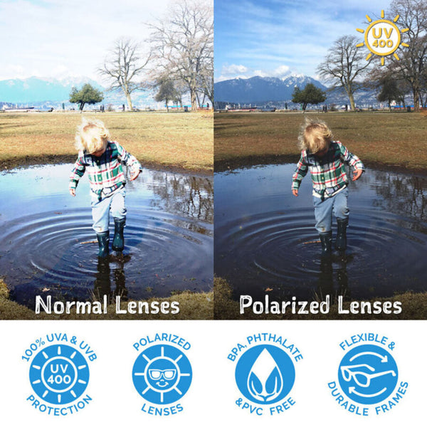 Flexible, un-break-able, stays-on! Polarized, shatter-resistant mirrored lenses. 100% UVA & UVB sun protection.